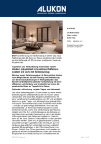 Das neue Raffstoresystem LS Dark basiert auf einer Weiterentwicklung der Lichtleitlamelle LS 80 von Alukon. Diese verfügt über eine besonders designte Lamellenkontur mit einer vordefinierten Lamellenstellung von 20° und ermöglicht dadurch zu jeder Tages- und Jahreszeit eine optimale Lichtnutzung im Raum sowie einen guten Durchblick nach außen – und das bei gleichzeitiger Blendfreiheit. Nun kann die Lichtleitlamelle LS 80 mit dem Raffstoresystem LS Dark kombiniert werden, womit eine Verdunkelung des Raumes möglich wird. Die Auf- und Ab-Bewegung des Behangs erfolgt über einen speziellen Seitenaufzug, der in den beiden Führungsschienen des Raffstores integriert ist. Dadurch kann auf die sonst üblichen Texbandlöcher in den Lamellen verzichtet werden. Somit tritt, im geschlossenen Zustand, wesentlich weniger Tageslicht in den Innenraum. Zur Verhinderung des seitlichen Lichteinfalls kommen zusätzlich spezielle Bürsteneinlagen in den Führungsschienen zum Einsatz. Seitlich über Führungsschienen und Lamellen angebrachte Aluminium-Abdeckbleche runden das Verdunkelungssystem durch Reduzierung von Lichtreflektionen ab. Das Zusammenspiel dieser Komponenten sorgt für eine effektive Verdunkelung und macht den Einsatz des Raffstoresystems LS Dark insbesondere auch in Schlafzimmern problemlos möglich.