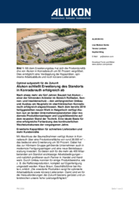 Nach etwas mehr als fünf Jahren Bauzeit hat Alukon – einer der führenden Anbieter im Bereich Rollladen, Sonnen- und Insektenschutz – den umfangreichen Umbau und Ausbau am Hauptsitz im oberfränkischen Konradsreuth erfolgreich abgeschlossen. Nach dem bereits 2019 fertiggestellten neuen Werk in Haigerloch verfügt Alukon nun an beiden Unternehmensstandorten über modernste Produktionsanlagen und Logistikbereiche auf dem neuesten Stand der Technik. Eine ideale Basis für eine erfolgreiche Fortsetzung des kontinuierlichen Wachstumskurses der vergangenen Jahre.