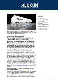 Alukon goes digital: Erstmals wird der Hersteller von Rollladen, Sonnen- und Insektenschutzsystemen seine Produktneuheiten 2021 online präsentieren. Neben der Beteiligung an der Premiere der „R+T digital“ startet Alukon parallel zum Messeauftakt am 22. Februar 2021 eine interaktive Website mit einem umfangreichen Informationsangebot zu den Innovationen.