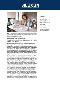 Bei der Gebäudeplanung legen Architekten Wert auf Schnelligkeit und Präzision. Gleichzeitig sollen Planungsfehler vermieden werden. Um ein einfaches und zügiges Konstruieren zu ermöglichen, steht Architekten und Planern für Alukon Produkte daher ab sofort eine herstellereigene CAD-Konstruktionshilfe zur Verfügung. Durch diese lassen sich baukastenartig sämtliche Einzelteile einer Produktgruppe in digitale Zeichnungen einfügen.