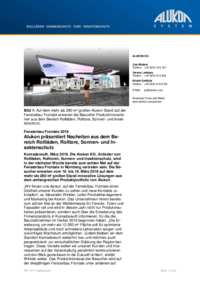 Konradsreuth, März 2016. Die Alukon KG, Anbieter von Rollläden, Rolltoren, Sonnen- und Insektenschutz, wird in der nächsten Woche bereits zum achten Mal auf der Fensterbau Frontale in Nürnberg vertreten sein. Die Besucher erwarten vom 16. bis 19. März 2016 auf dem mehr als 280 m² großen Stand innovative Lösungen aus dem umfangreichen Produktportfolio von Alukon.