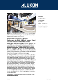 Auf der BAU 2025 präsentiert Alukon vom 13. bis 17. Januar 2025 viele interessante Neuheiten und Weiterentwicklungen rund um Rollladen sowie Sonnen- und Insektenschutzsysteme. Zudem können sich Fachbesucher aus Architektur, Planung und Fachhandel auf dem Messestand 320 in Halle C2 persönlich zu allen aktuellen Alukon Zukunftsthemen informieren und beraten lassen.