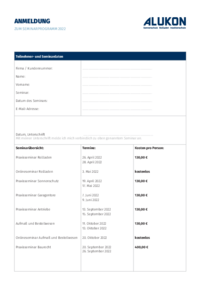 Werfen Sie einen Blick in unser Seminarprogramm 2022 und melden Sie sich einfach und unkompliziert mithilfe des interaktiven Anmeldeformulars (per E-Mail an michael.jaenisch(at)alukon.com) an.